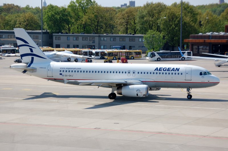 Hier die Airbus A 320-232 SX-DVJ auf dem Weg zur Startbahn, 25.04.09 Flughafen Berlin Tegel. Volker Stöckmann