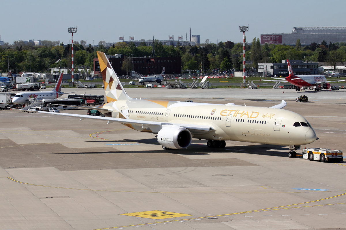 Etihad A6-BLF Boeing 787-9 Dreamliner beim Push-Back in Düsseldorf 5.5.2016