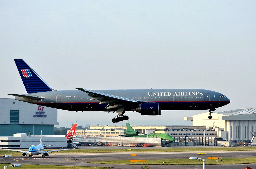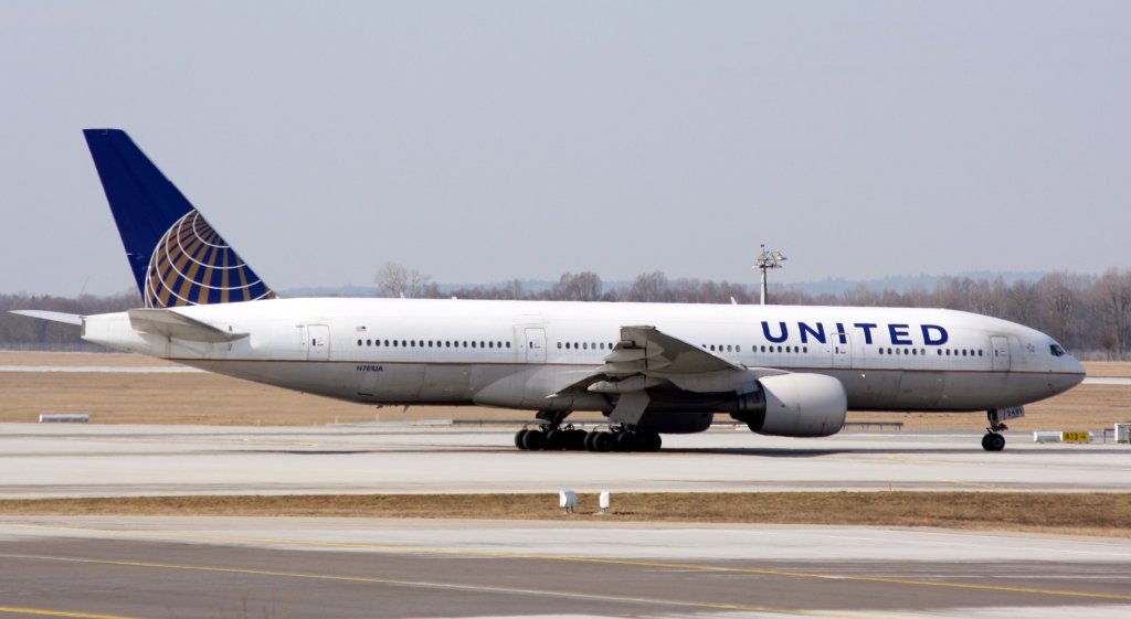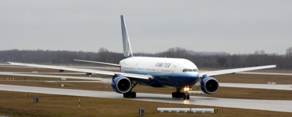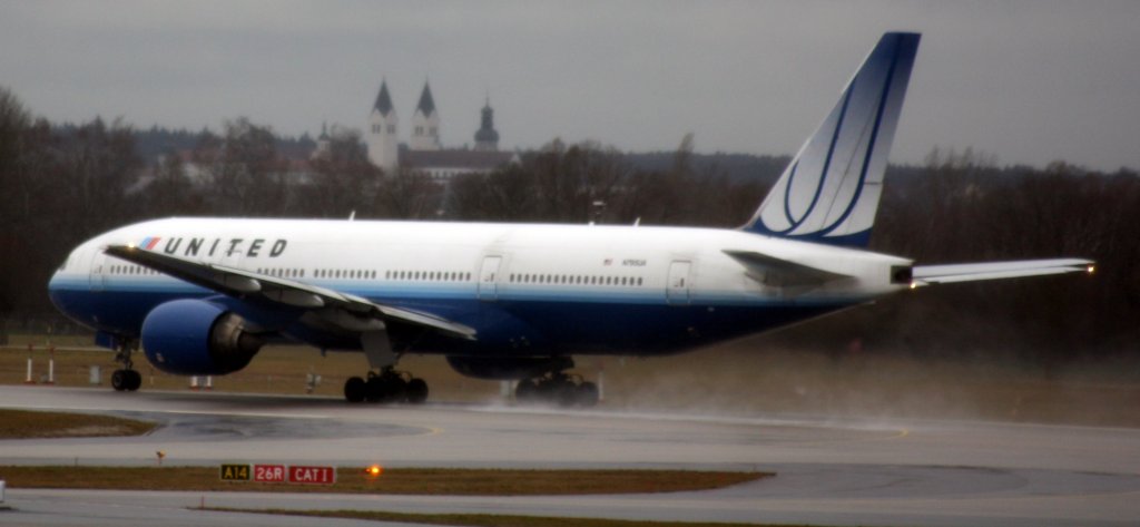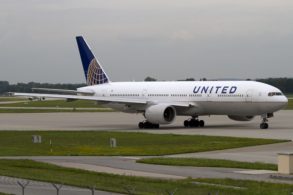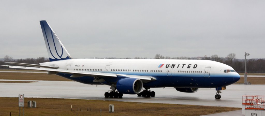 United Airlines, N796UA, Boeing 777-222/ER. Alle Fotos dieser kleinen Serie sind aus dem Fenster des Holiday Inn Hotels am frühen Morgen gemacht. 31.7.2011 Jürgen Walter