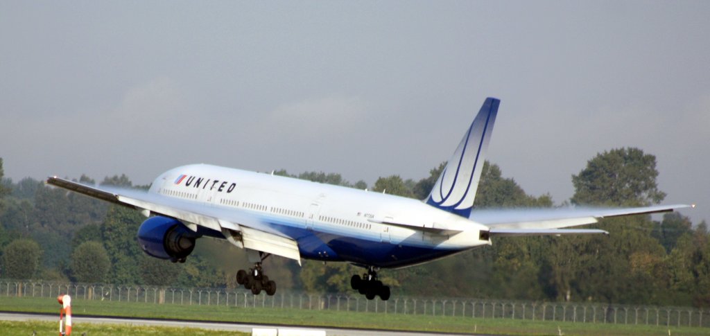 United Airlines Boeing 777-222 N772UA Kurz vor der Landung am Flughafen München am 11.09.2010