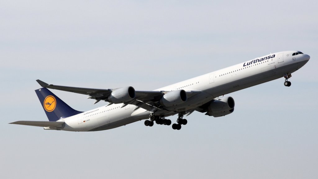 Lufthansa A 340-642 D-AIHA "Nürnberg" beim Start in München am 10.03.2011.Das Wetter wurde zum Abend etwas besser, blieb aber immer noch trüb.