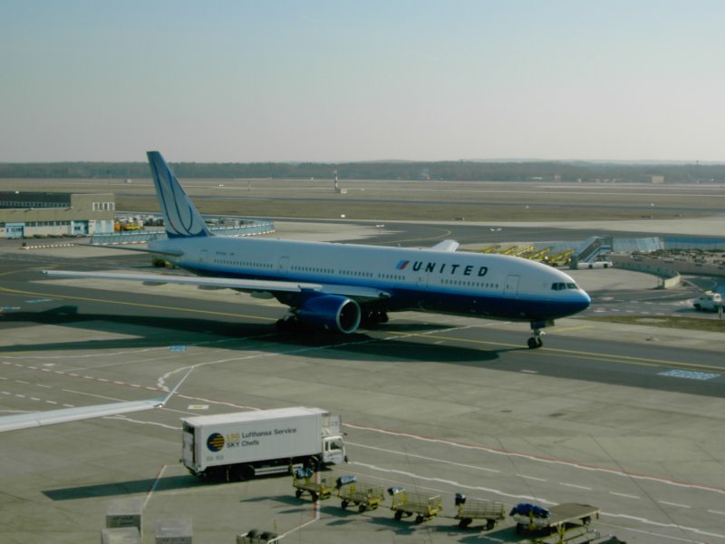 Boeing 777 der United rollt zur Starbahn 18 des Frankfurter Flughafens.(05.02.05)