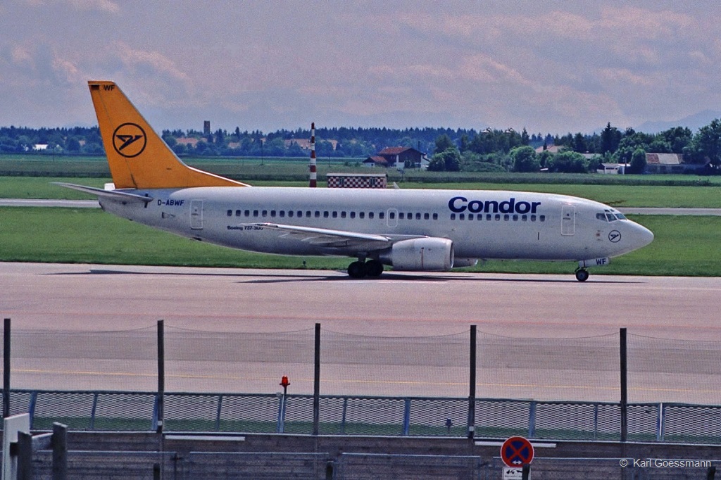 Condor, D-ABWF, B737-330 rollt nach der Landung in München-Riem zum Terminal. 23.06.1991 (Negativ-Scan)