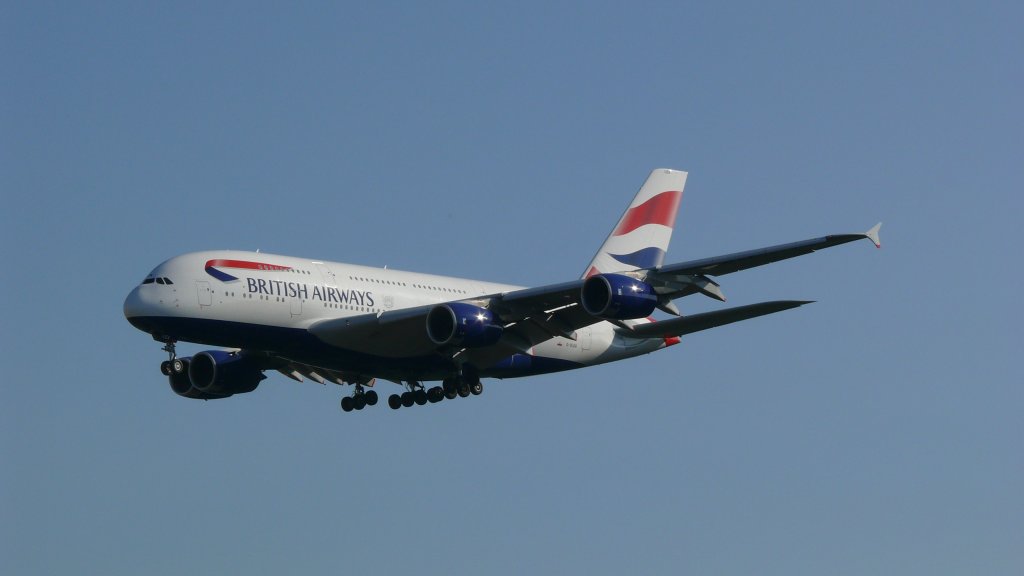 Ein Airbus A380-800 der Airline Lufthansa mit der Kennung D-AIMC im Anflug auf den Flughafen Frankfurt am Main(EDDF).