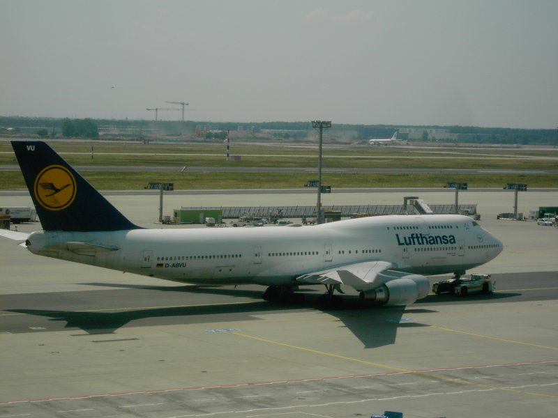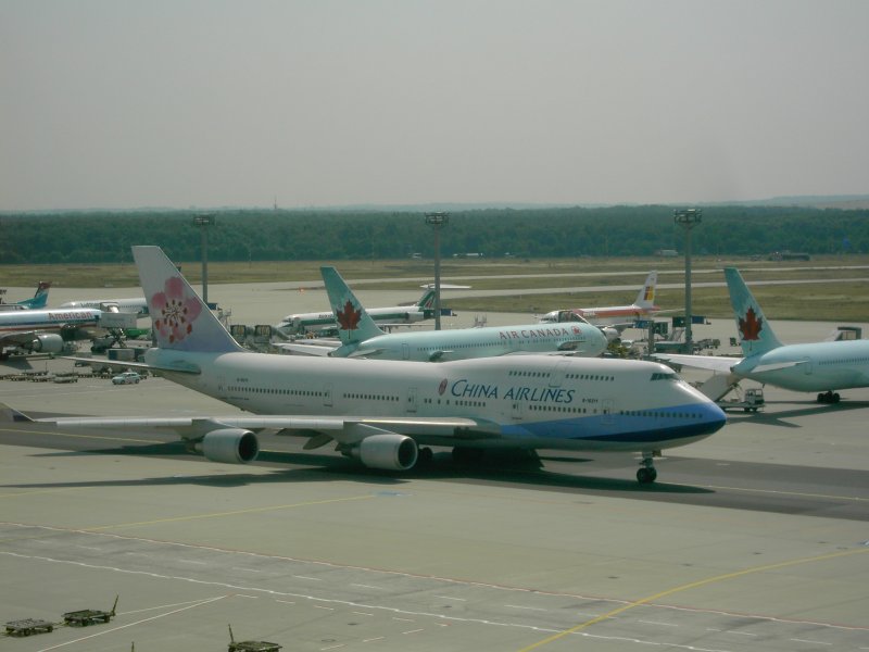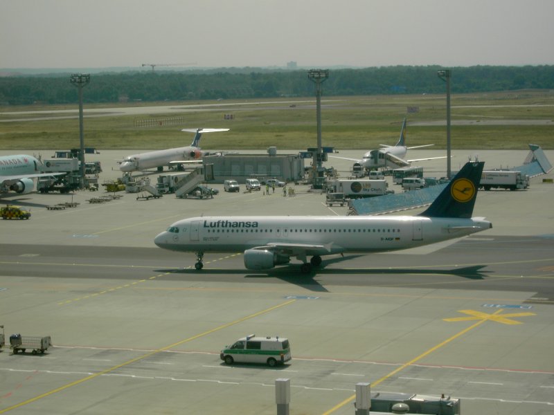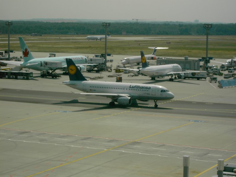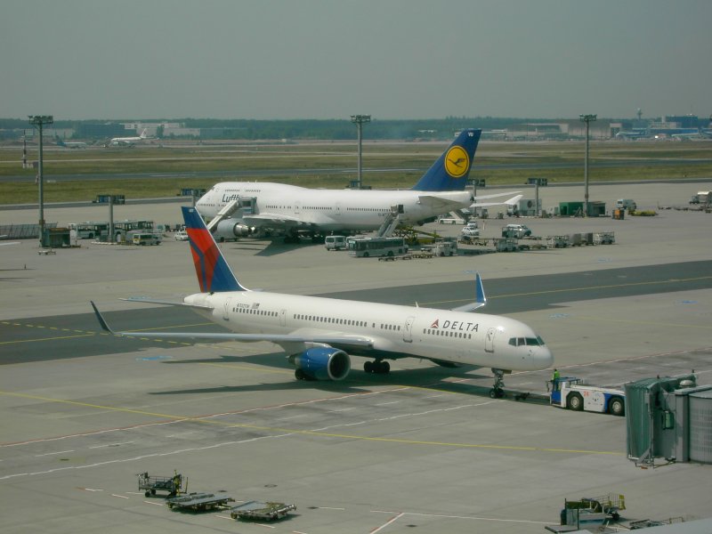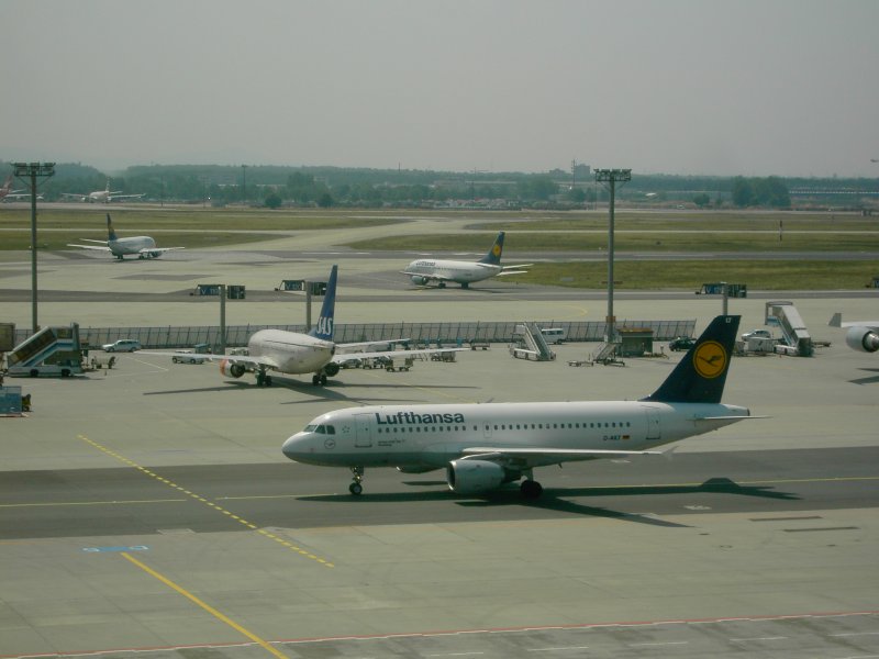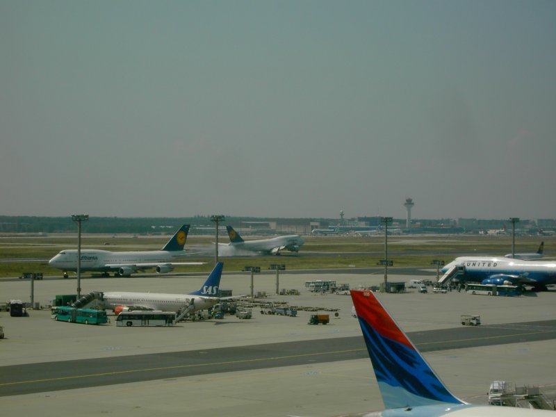 Der Flughafen Frankfurt am Main mit einer landenden Boeing 737 der Lufthansa und einer auf dem Rollfeld rollenden Boeing 747 der United Airlines. (16.07.2008) Andreas Mack