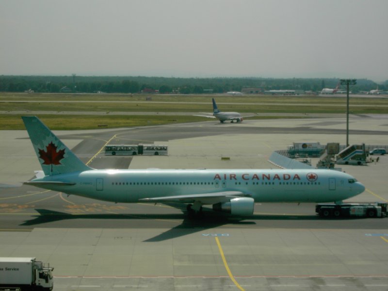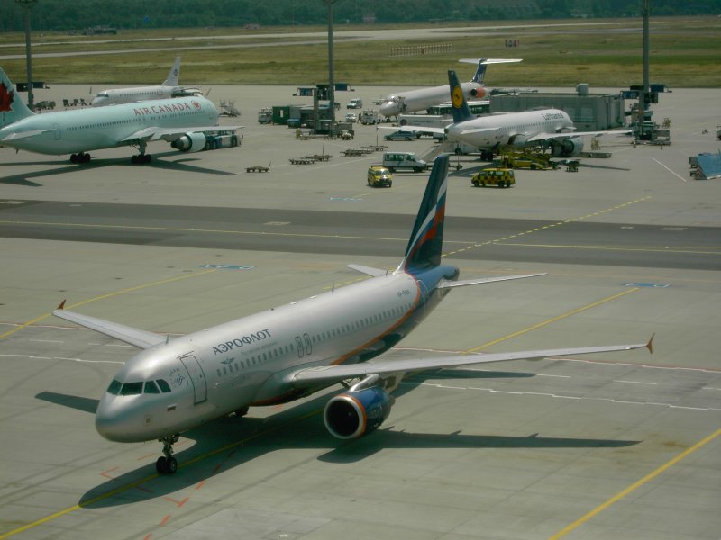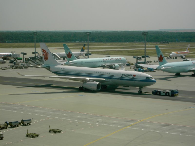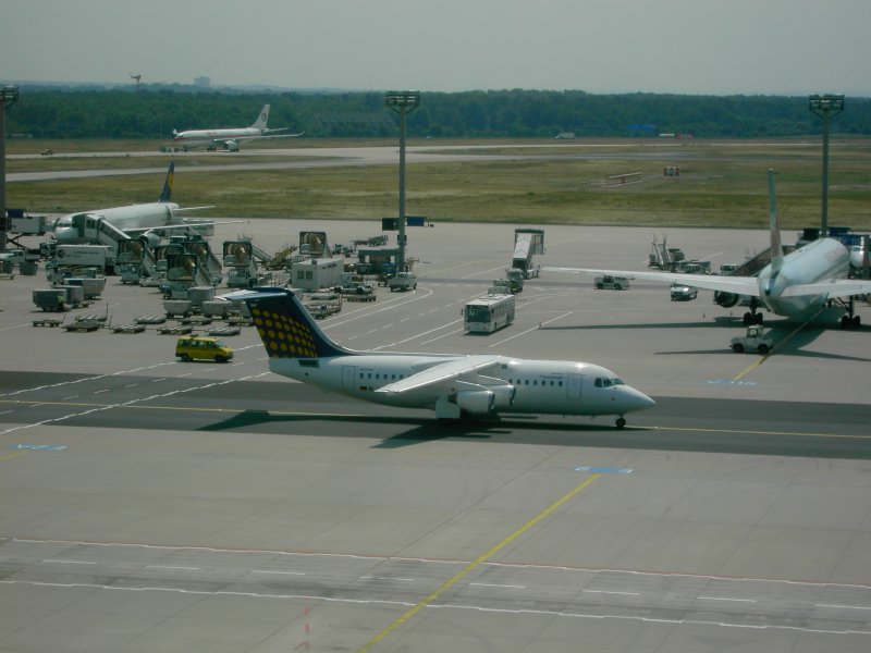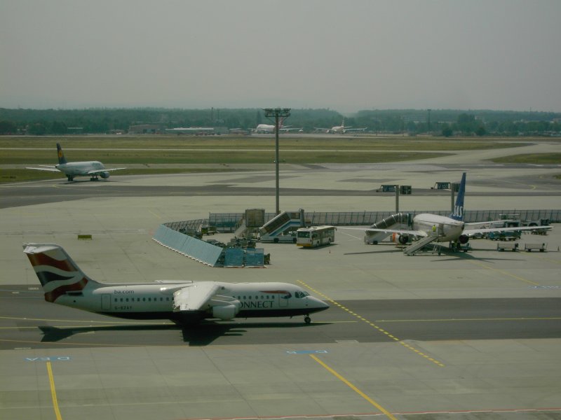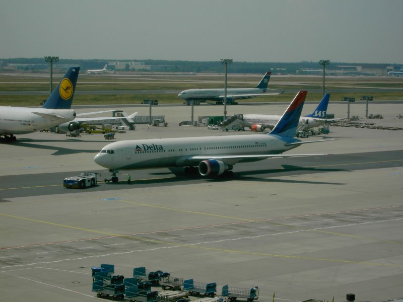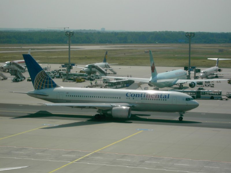 Der Flughafen Frankfurt am Main mit einer landenden Boeing 737 der Lufthansa und einer auf dem Rollfeld rollenden Boeing 747 der United Airlines. (16.07.2008) Andreas Mack