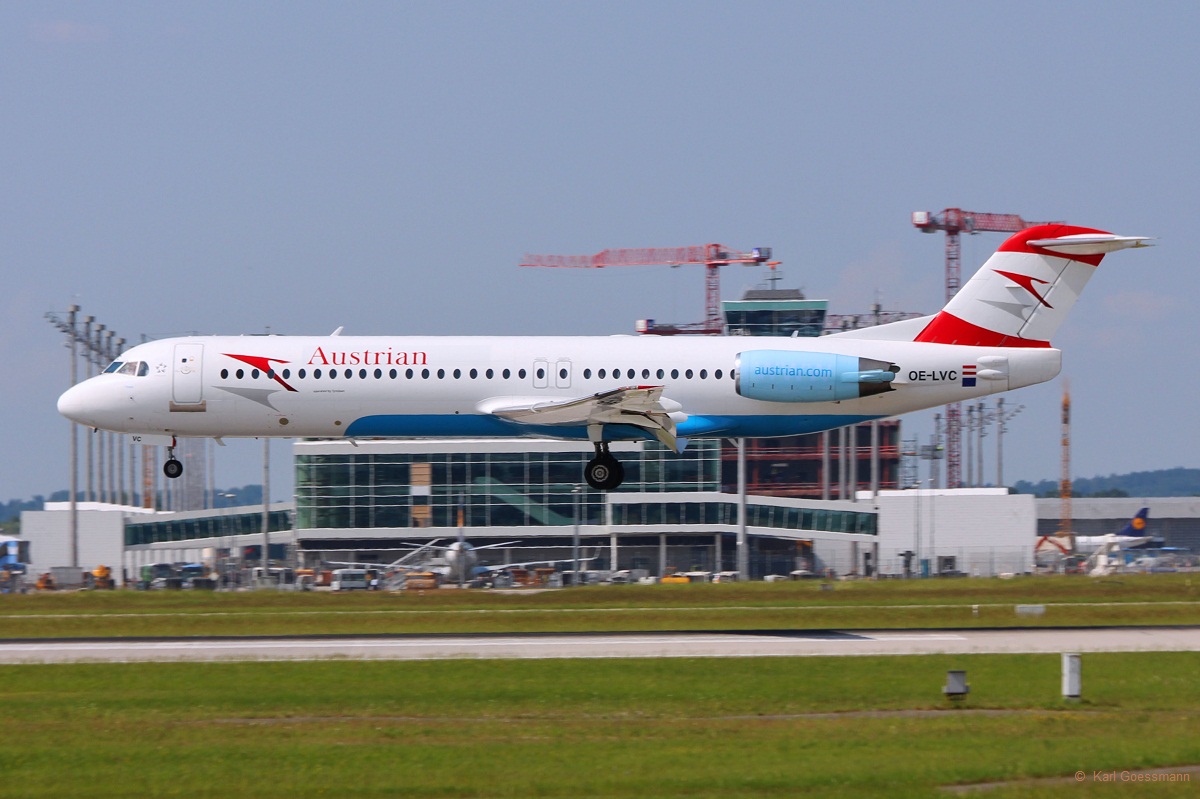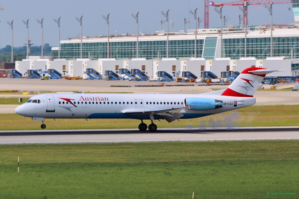OE-LVJ "Bratislava" / Austrian Airlines / Fokker 100 in MUC bei der Landung aus Wien (VIE) 13.06.2014