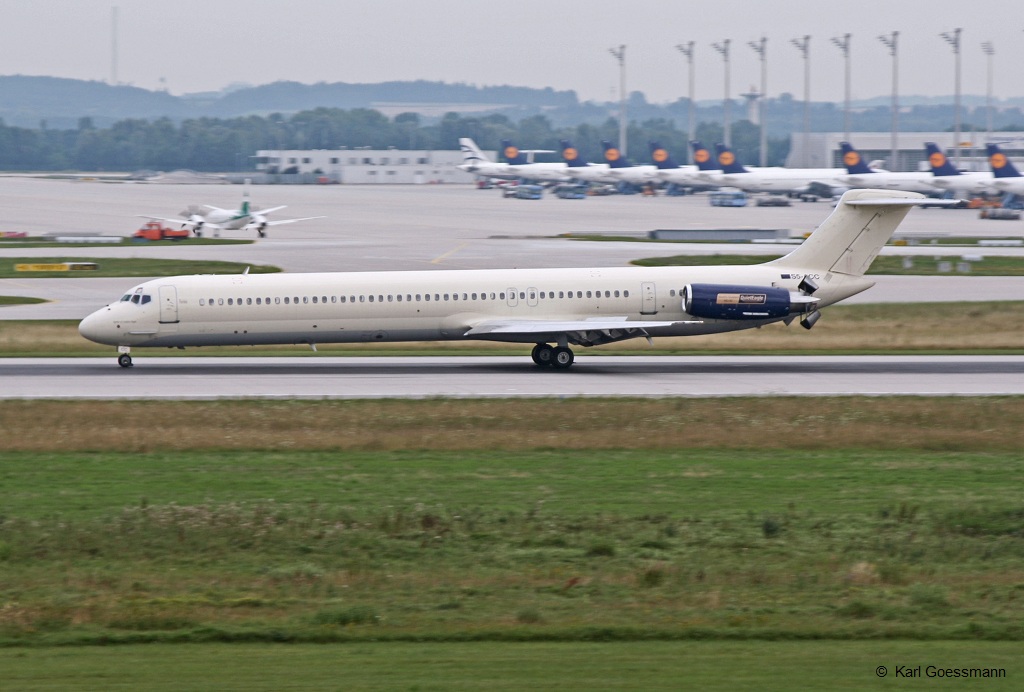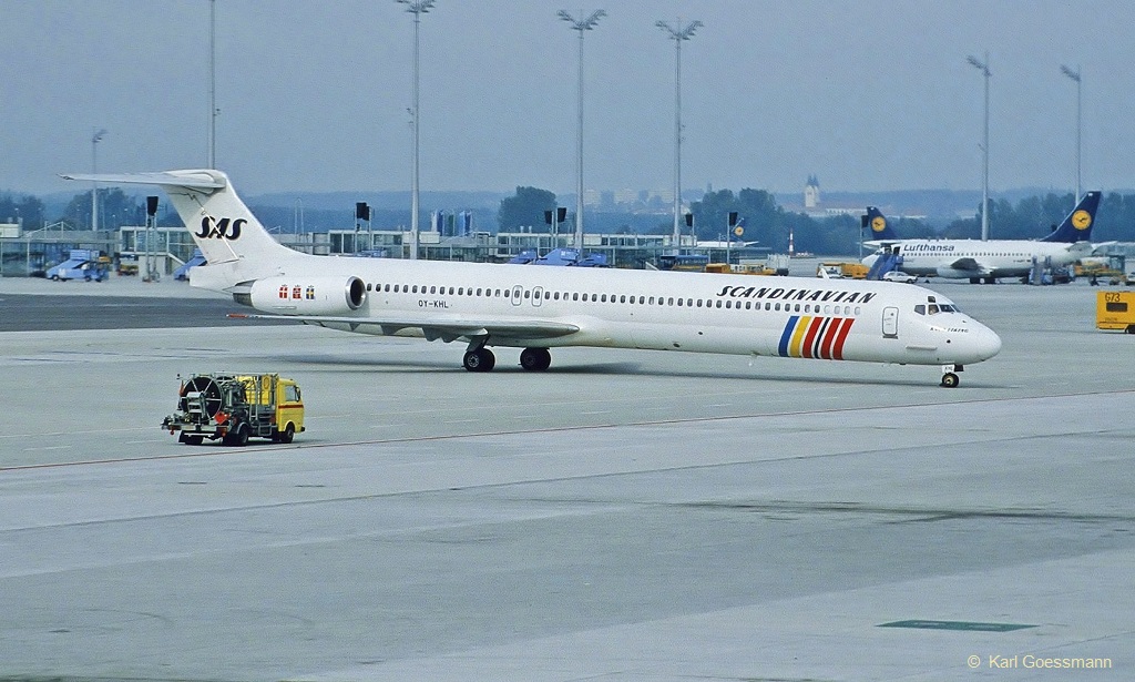 SAS Scandinavian, OY-KHL "Knud Viking", McDonnell Douglas MD 81 rollt nach der Landung in MUC zum Terminal 1. 12.10.1992 (Scan vom Dia) Karl Goessmann