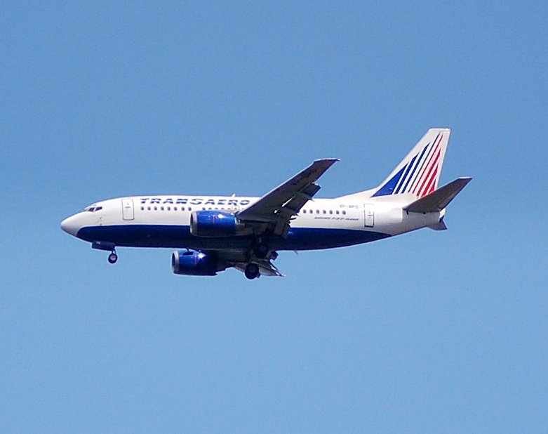 Ein Flugzeug der ersten rein russischen Privatfluggesellschaft, der 1991 gegründeten Transaero Airlines, eine Boeing 737-5K5 VP-BPD beim Landeanflug zum Flughafen Berlin-Tegel, 14.06.08. Volker Stöckmann