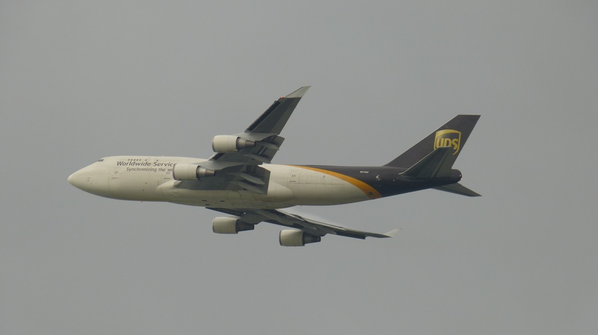 Boeing 747-45E von UPS am 31.3.2014 beim Start in Hongkong. Die Kennung lautet N579UP.
