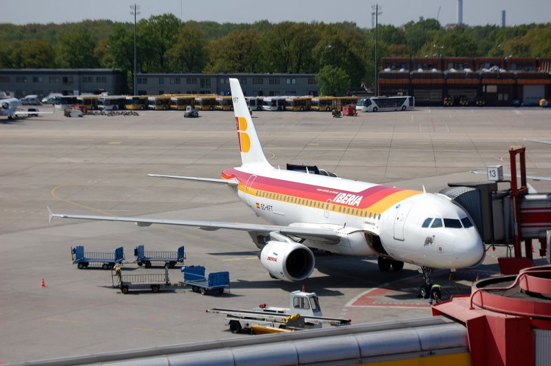 Ein Iberia Airbus A 319-111 EC-KFT am Gate auf dem Flughafen Berlin Tegel, 25.04.09.