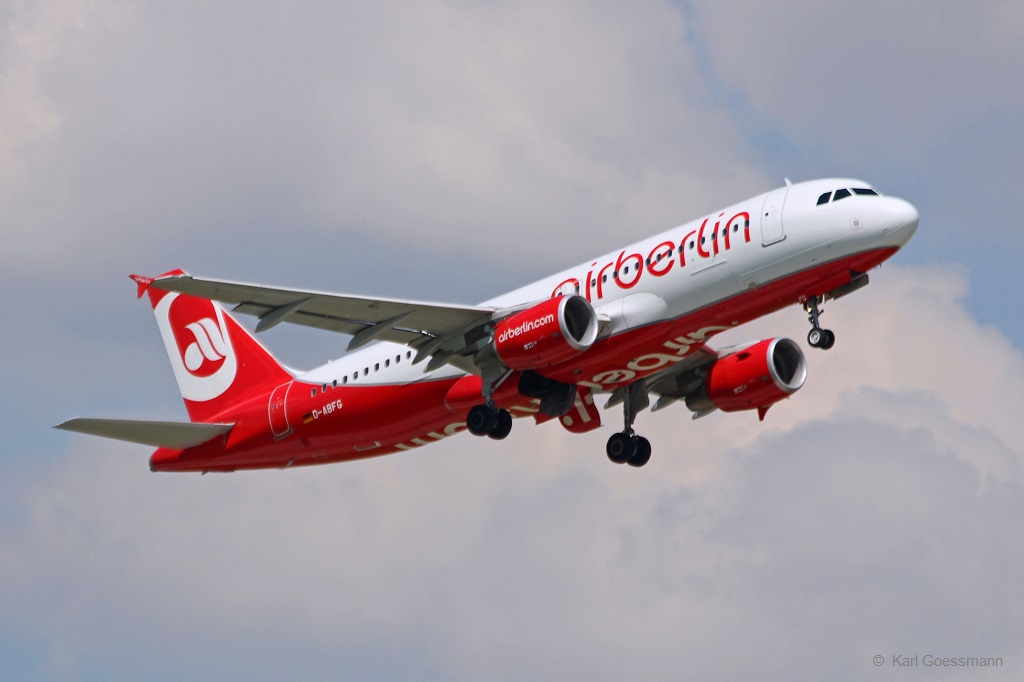 Air Berlin, D-ABFG, A320-214 in MUC im Steigflug nach Palma de Mallorca (PMI) 01.07.2013