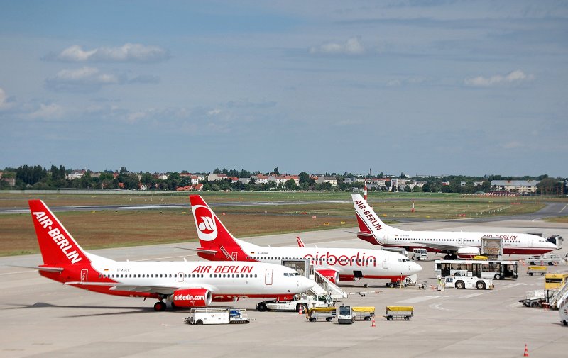 Da standen heute durch Zufall alle drei gängigen Air Berlin Farbdesignvarianten + unterschiedlich Boeing 737 Varianten direkt nebeneinander auf dem Vorfeld in Berlin Tegel, von vorn nach hinten: Air Berlin Boeing 737-75B D-AGEL, Air Berlin Boeing 737-76J D-ABLB und zuletzt Air Berlin Boeing 737-85F D-ABBM, 24.05.09. Volker Stöckmann