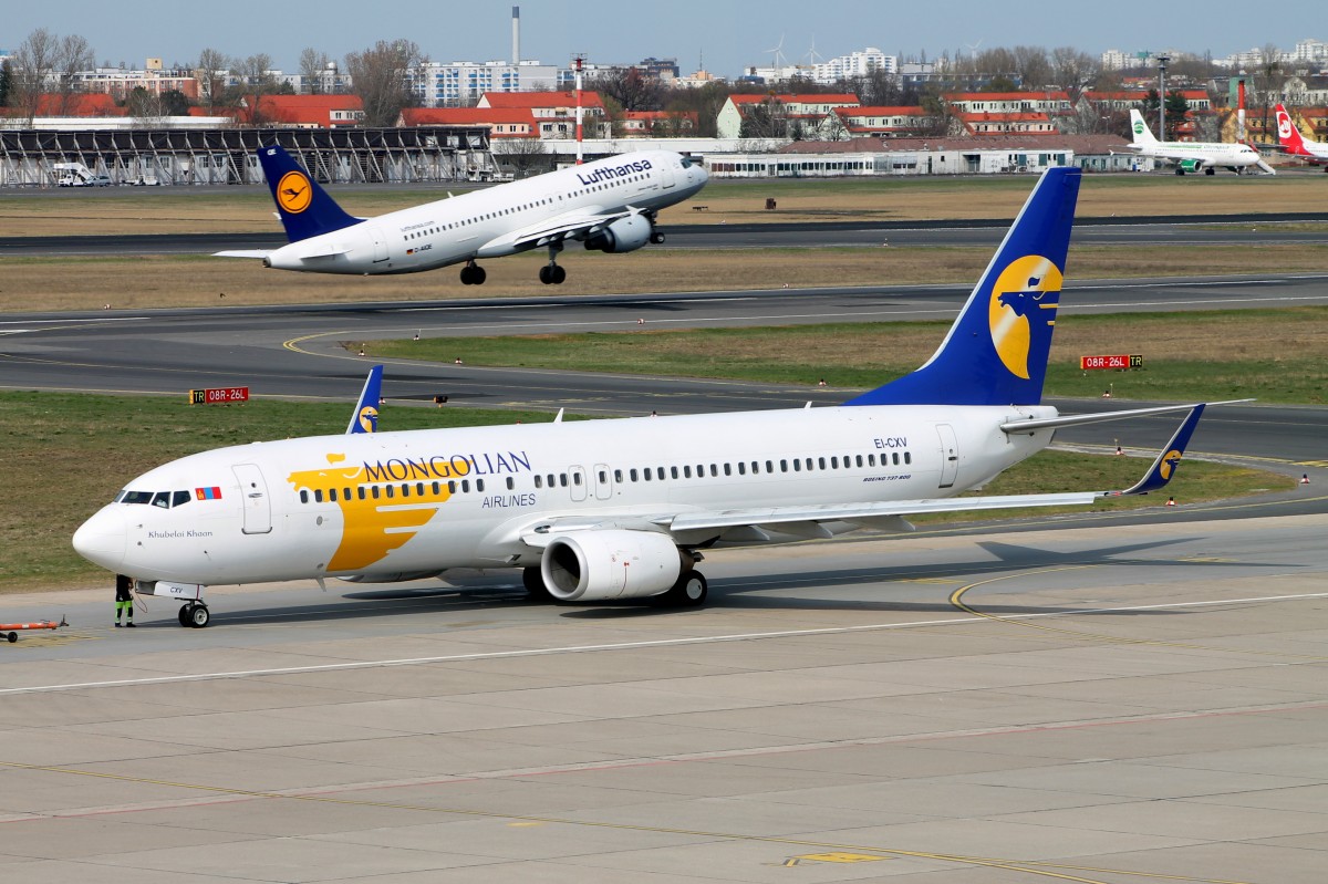 MIAT Mongolian Airlines Boeing B737-8CX EI-CXV und Lufthansa A320 D-AIQE in Berlin-Tegel im April 2013.