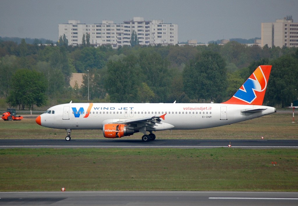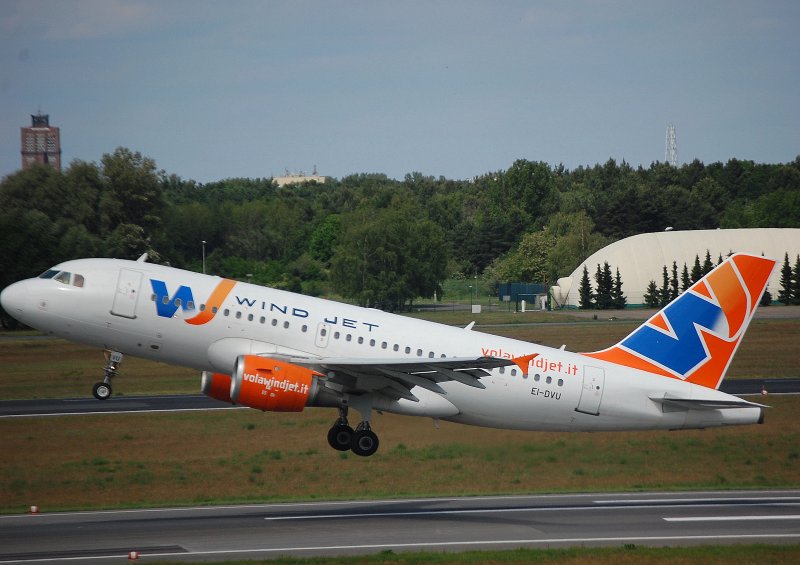 Die italienische Billigfluggesellschaft Wind Jet startet gerade mit einem Airbus A 319-113 EI-DVU, Flughafen Berlin Tegel 24.05.09.