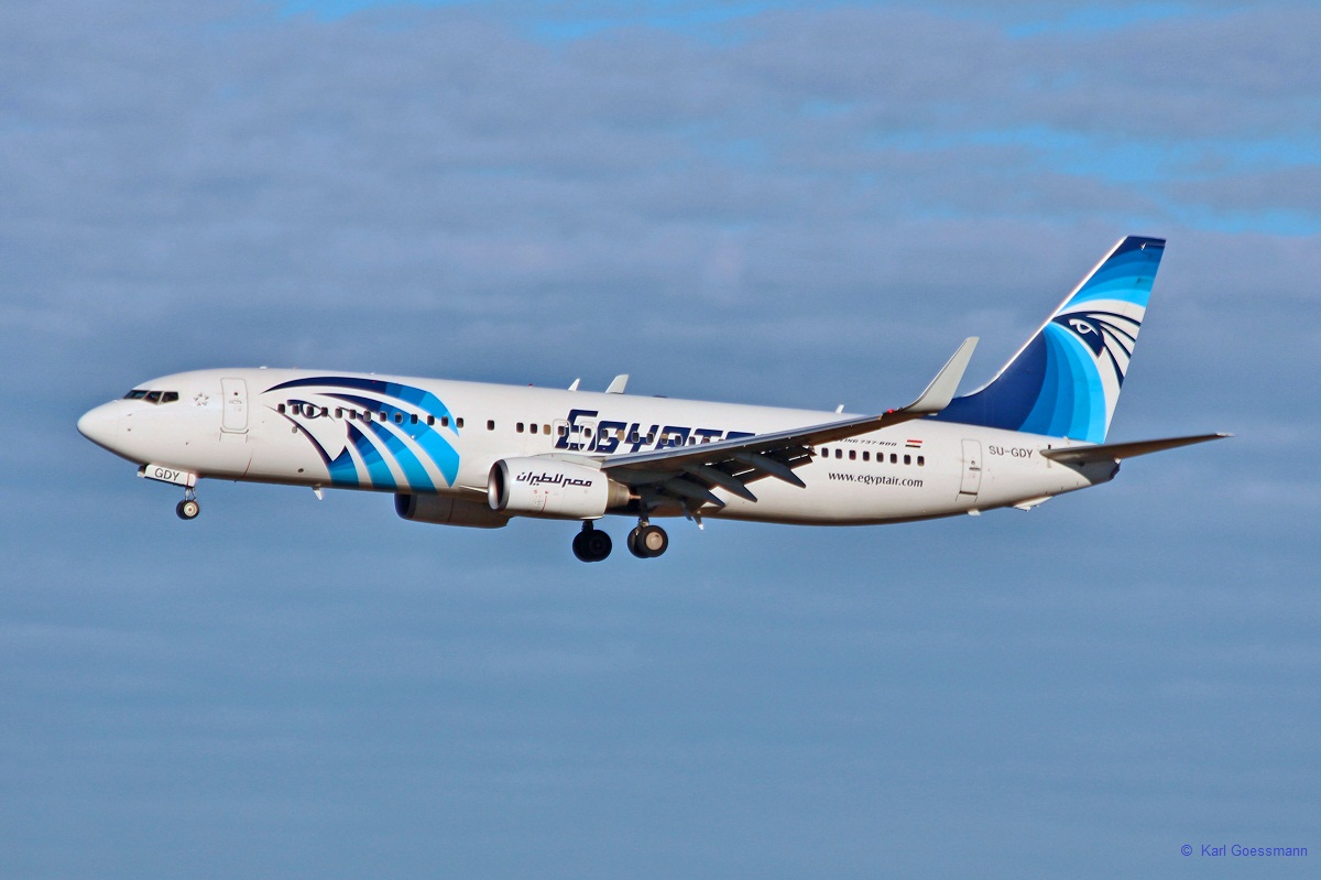Eine Boeing 737-800 der EgyptAir mit der Kennung SU-GEB im Anflug auf den Flughafen Frankfurt am Main(EDDF).