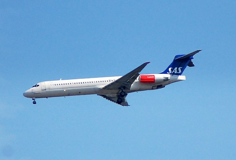 Scandinavien Airlines mit McDonnell Douglas MD 82 LN-ROS beim Landeanflug zum Flughafen Berlin-Tegel, 10.06.08.
