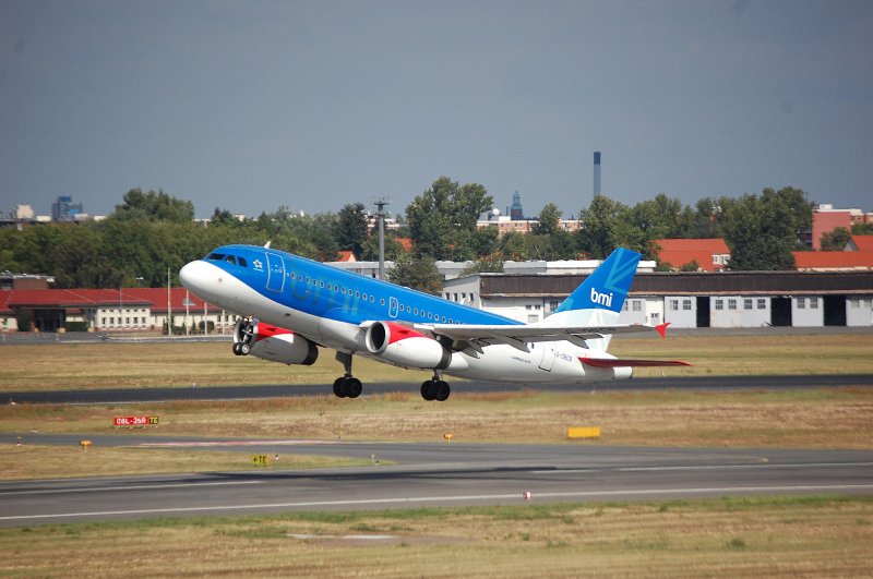 Mit typisch kurzem Startanlauf hebt eine Airbus A319-131 G-DBCB der British Midland in Berlin Tegel ab, 30.08.09.