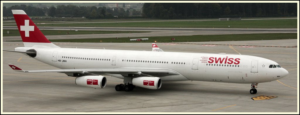 Ein Airbus A-340-313X von Swiss International Air Lines mit der Kennung HB-JMJ aufgenommen am 03.10.2010 am Züricher Flughafen.