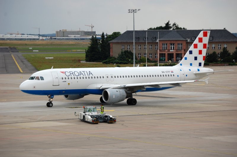 Croatia Airlines mit Airbus A320-211 9A-CTF bei den Startvorbereitungen am Flughafen Berlin-Schönefeld, 19.07.08.