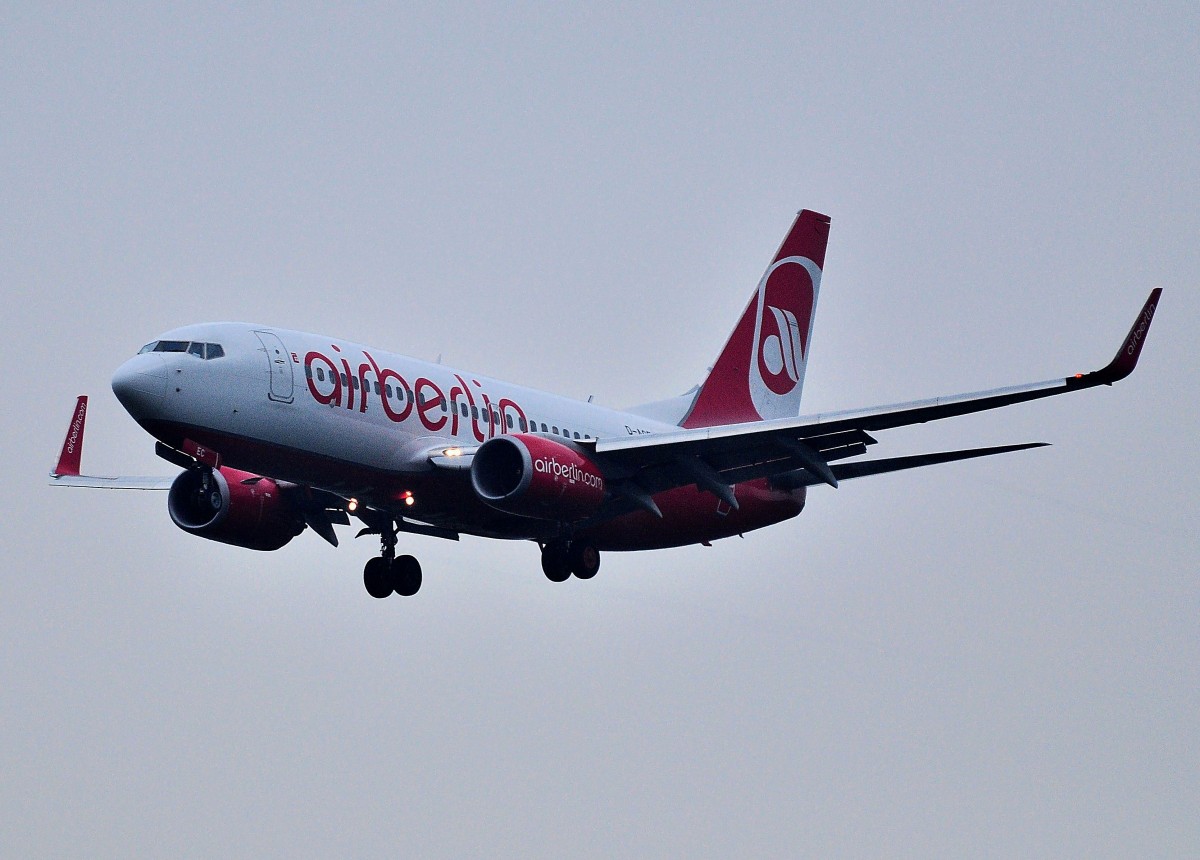 BOEING 737-76J der AIR BERLIN mit der Kennung D-AGEC am 26.9.2013,leider bei sehr "diesigem" Wetter im Landeanflug auf FRA L25.