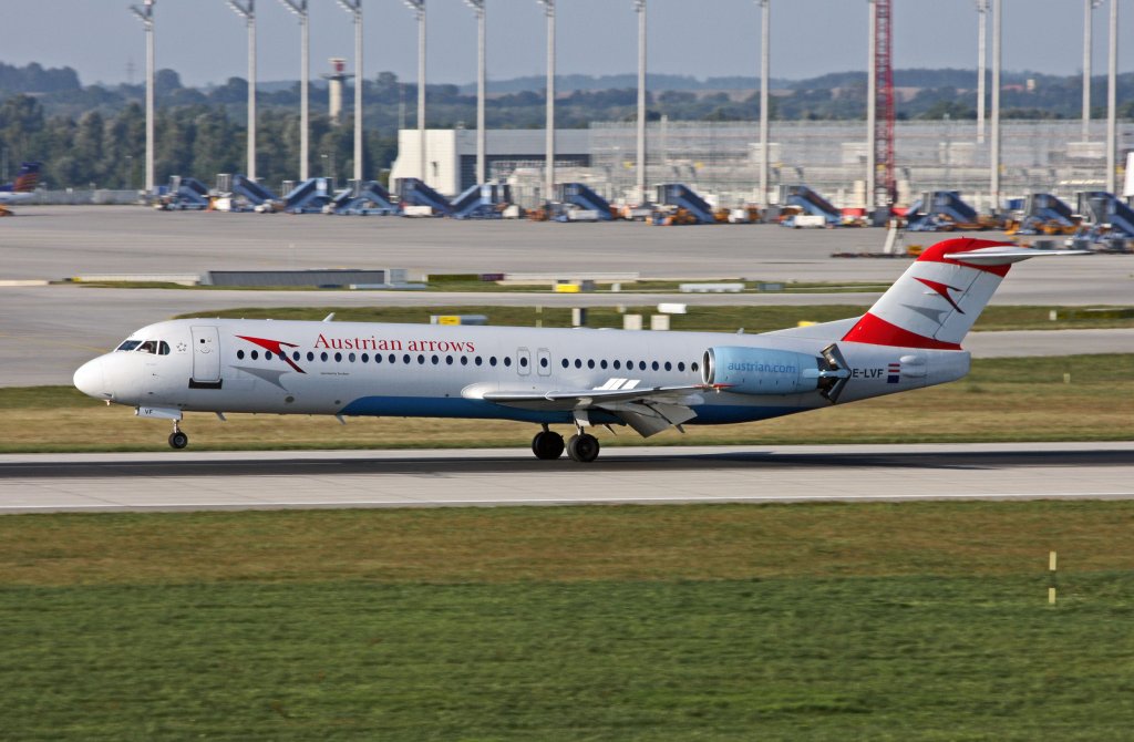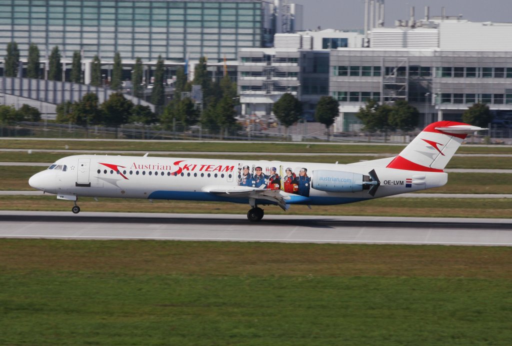 Austrian Airlines, OE-LVN  Dnepropetrovsk , Fokker 100 beim Start in MUC nach Wien (VIE)  16.03.2013