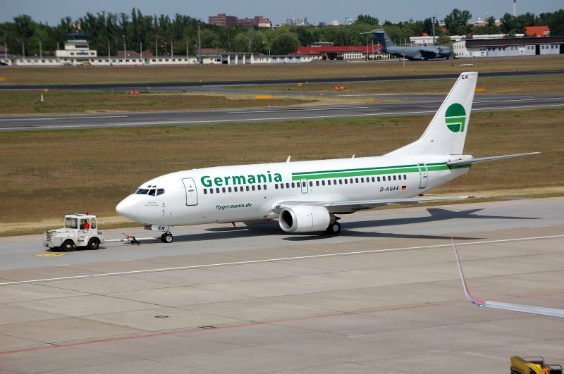Diese Germania Boeing 737-3M8 D-AGEK hat ihr heutiges Programm absolviert und wird an den Vorfeldrand am Hangar des Flughafen Berlin Tegel gezogen, 09.05.09 Flughafen Berlin Tegel. Volker Stöckmann