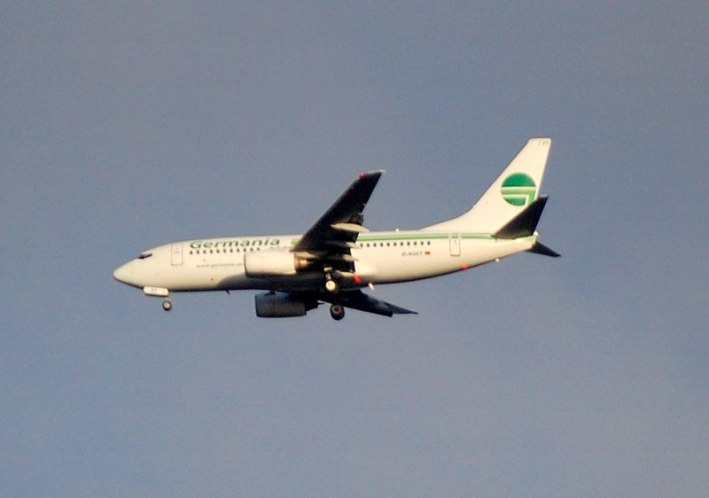 Frühere Hapag Lloyd Express, jetzt Germania Boeing 737-75B D-AGET beim Landeanflug zum Flughafen Berlin Tegel, 23.12.08 Berlin Pankow. Volker Stöckmann