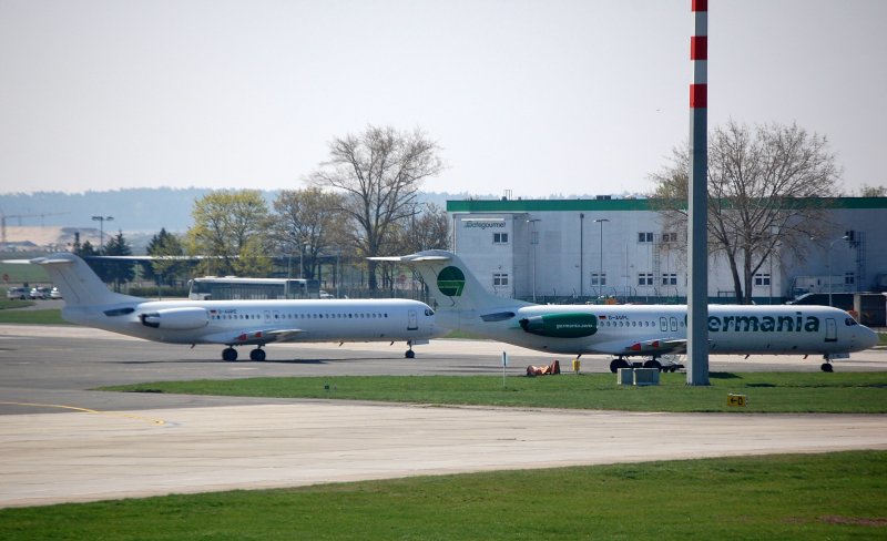 Zwei Fokker F-100 die Germania (gehört zu Air Berlin) D-AGPL und die im Moment völlig weiße Air Berlin D- AGPE sind momentan am Rande des Vorfelds des Flughafen Berlin-Schönefeld abgestellt, 13.04.09. Volker Stöckmann
