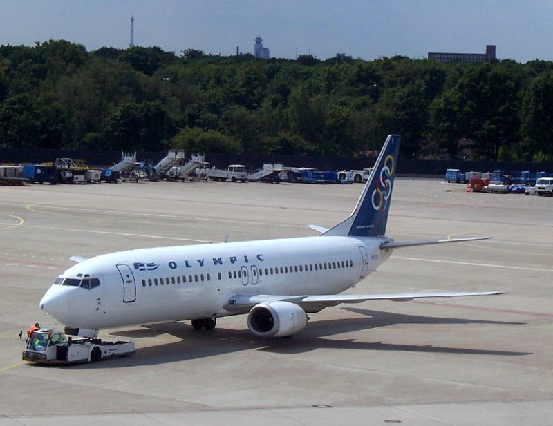 Bildersammlung 2006: Eine Olympic Airlines mit einer Boeing 737-484 SX-BKC wird vom Gate auf die Fahrbahn geschoben am Flughafen Berlin Tegel. Volker Stöckmann