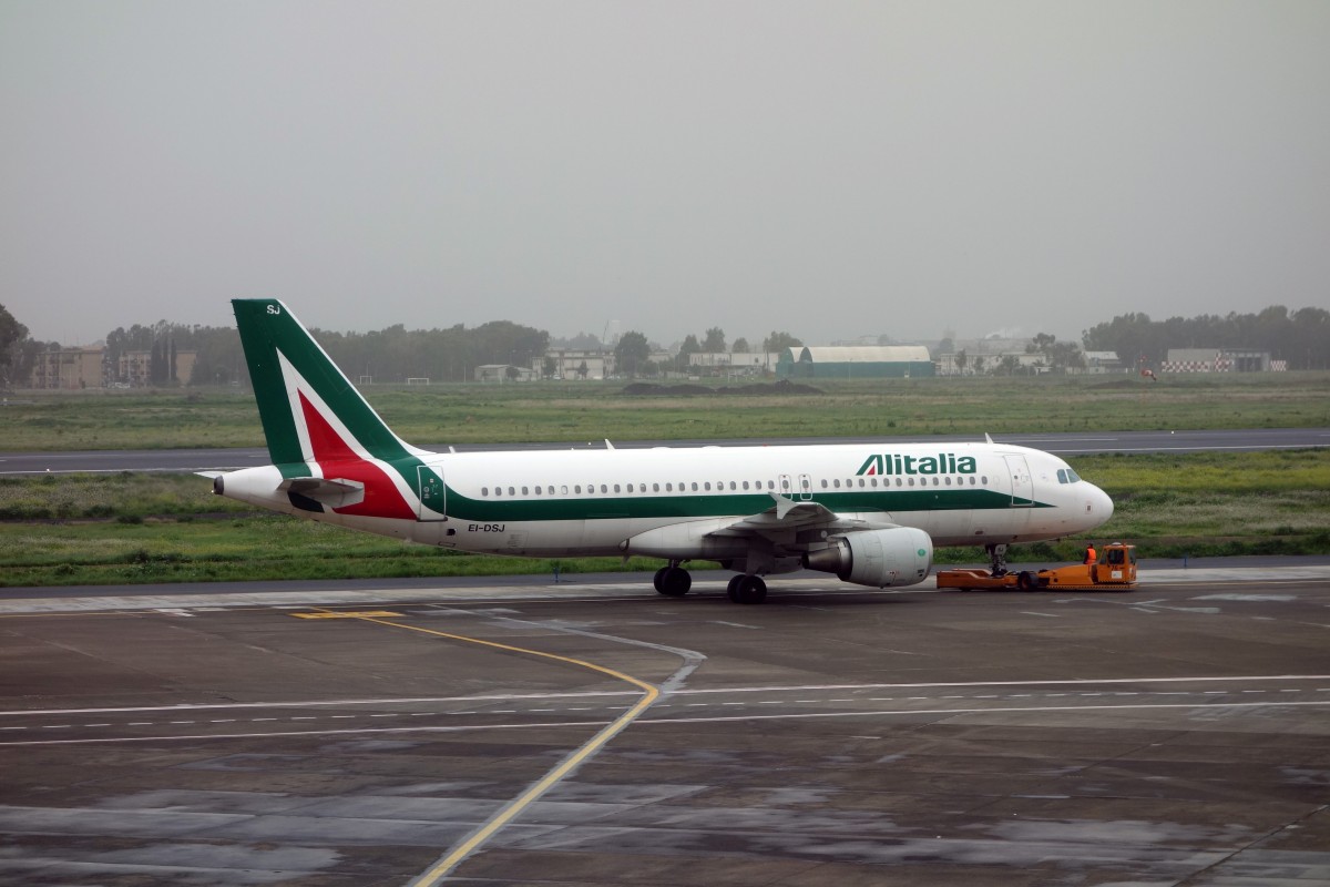 AlItalia Airbus A 320 (EI DSJ) wird aus der Parkposition geschoben. Catania 31.01.2014