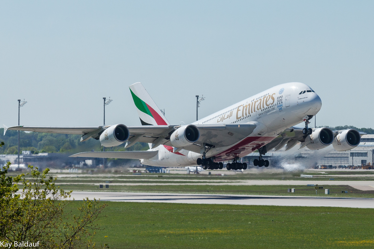 Airbus A380-800 beim Starten auf der südlichen Startbahn in München, 17.05.17