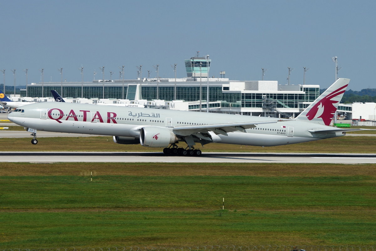 Qatar Airways Boeing B777-3DZ(ER) A7-BAO, cn(MSN): 36011, Flughafen München, 20.08.2018.