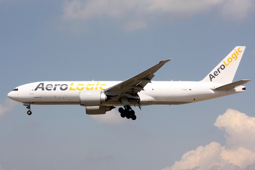 AeroLogic Boeing 777F (D-AALC) bei der Landung auf dem Flughafen Leipzig/Halle. Fotografiert am 31.05.2014.