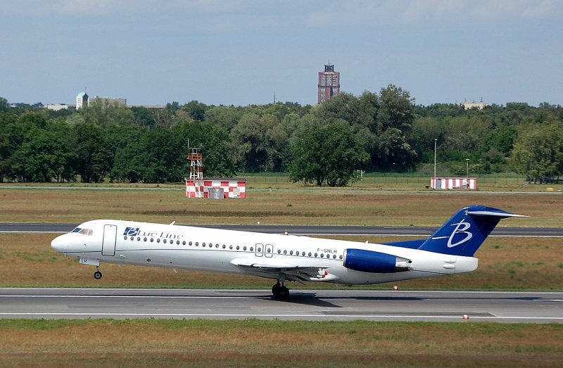 Die französische Fluggesellschaft Blue Line für den VIP und Charterbereich startet mit einer Fokker F-100 F-GNLH in Berlin-Tegel, 24.05.09. Volker Stöckmann