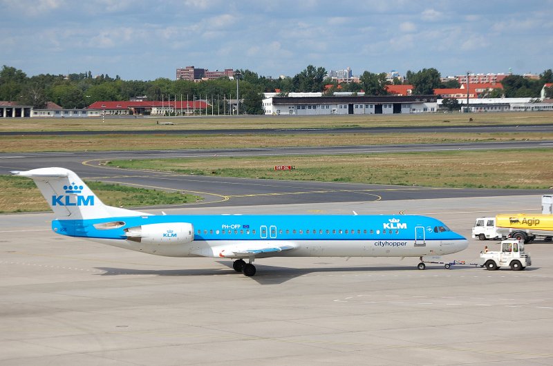 Eine KLM cityhopper Fokker F-100 (PH-OFP) wird gerade aus der Parkposition zur Startvorbeitung gschoben, 31.07.09 Flughafen Berlin-Tegel. Volker Stöckmann