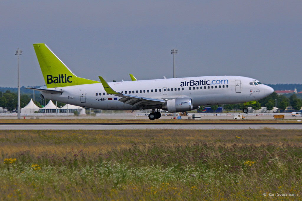 Air Baltic, YL-BBY, B737-36Q(W) in MUC bei der Landung aus Riga (RIX) 09.07.2013
