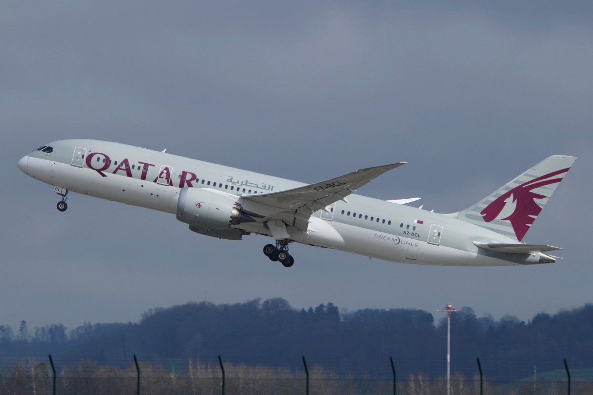 Qatar Airways Boeing B787-8 Dreamliner startet auf Rwy 28 in Zürich, 03.04.2015.