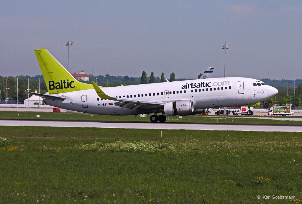 Air Baltic, YL-BBI, B 737-33A(W) bei der Landung in MUC aus Riga (RIX) 15.05.2013