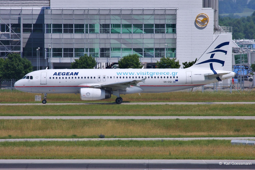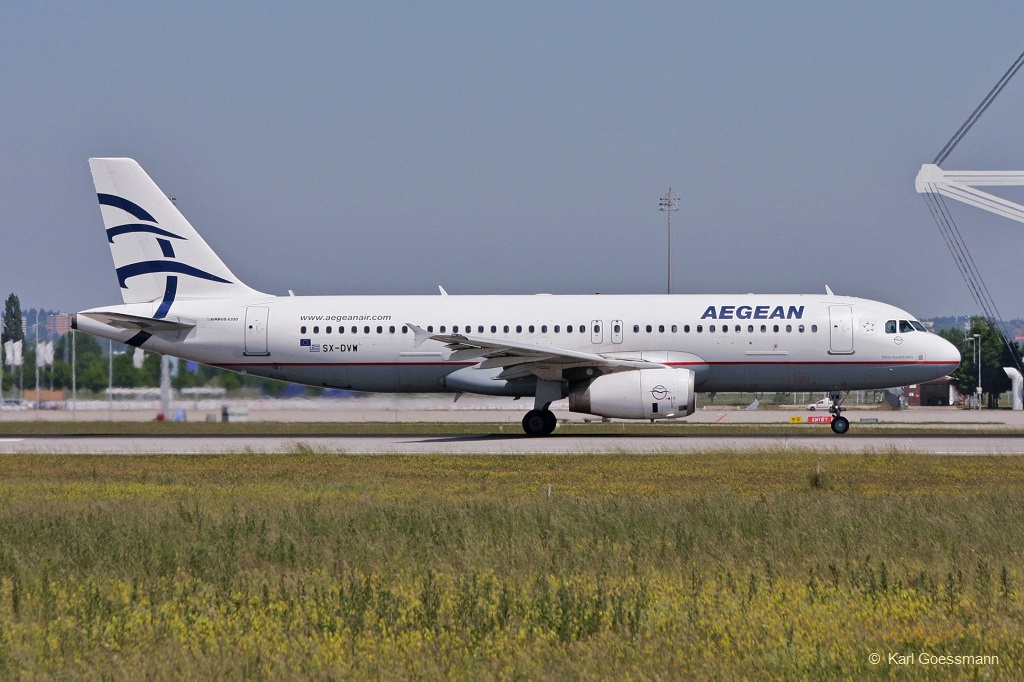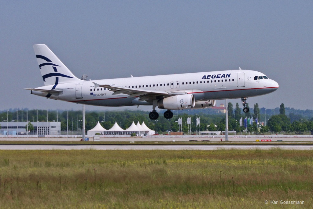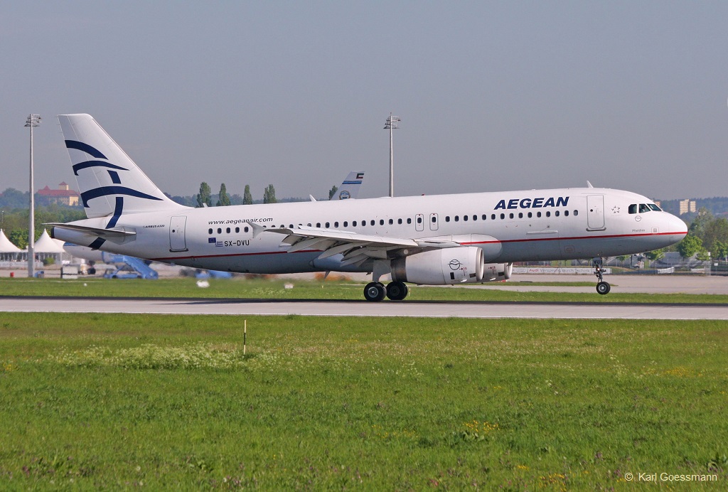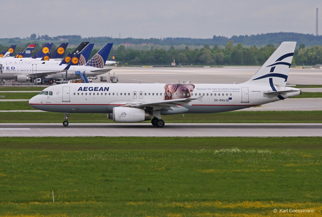 Aegean Airlines, SX-DVU "Pheidias", A320-232 beim Start in MUC nach Thessaloniki (SKG) 14.05.2013 Die Maschine trägt backbord die Aufschrift "Discover the new Acropolis museum". Karl Goessmann