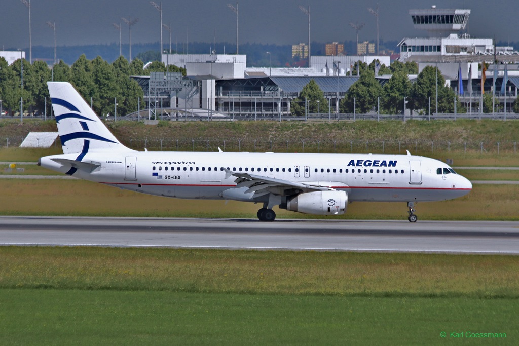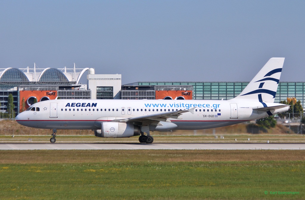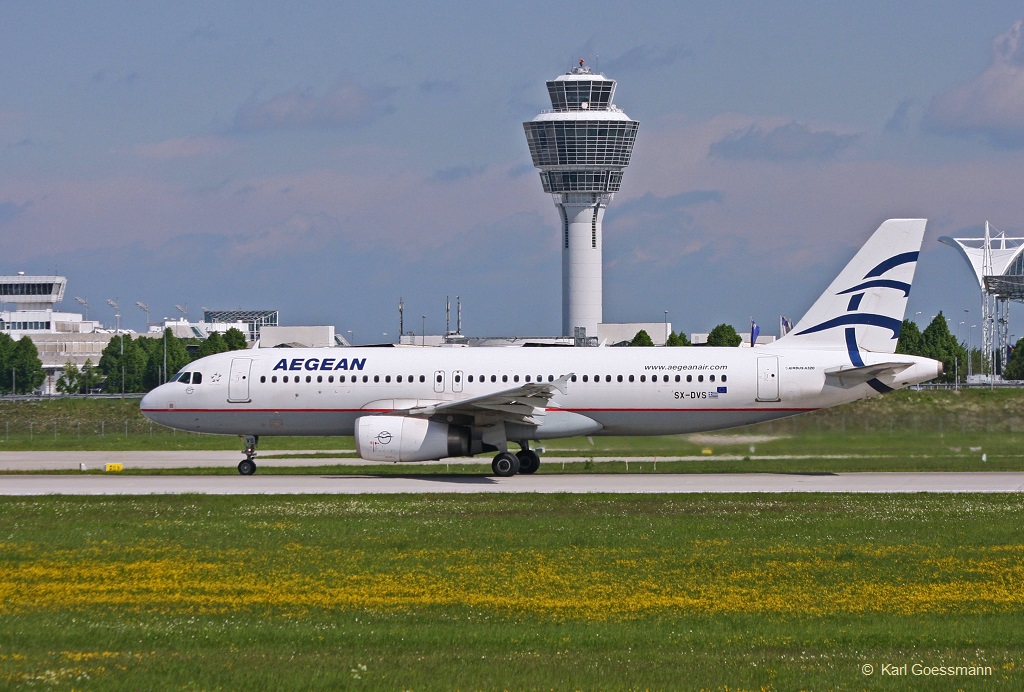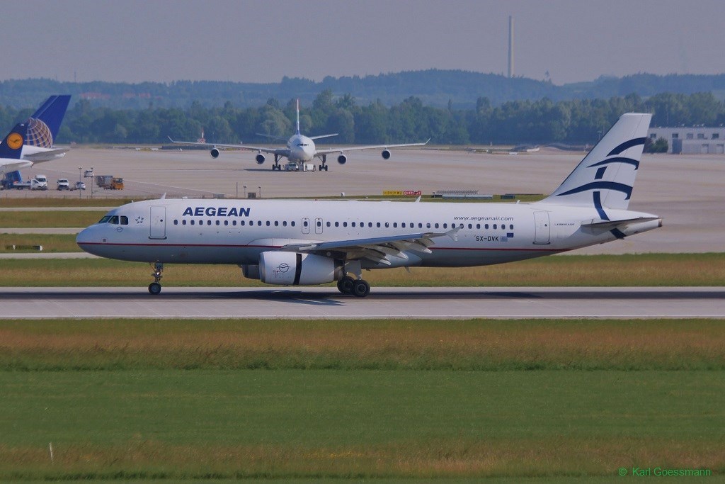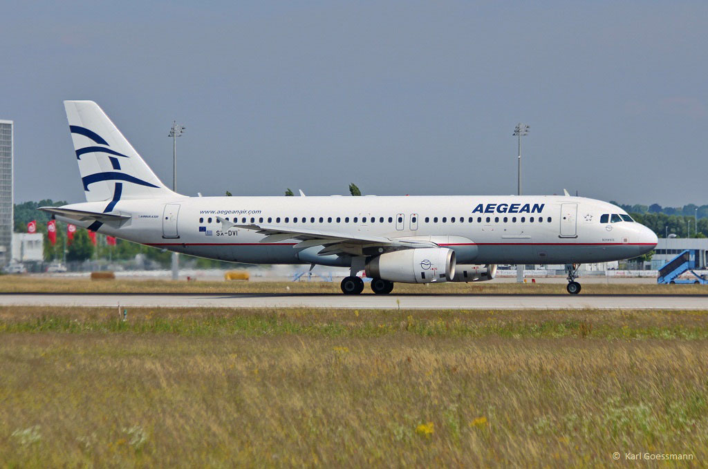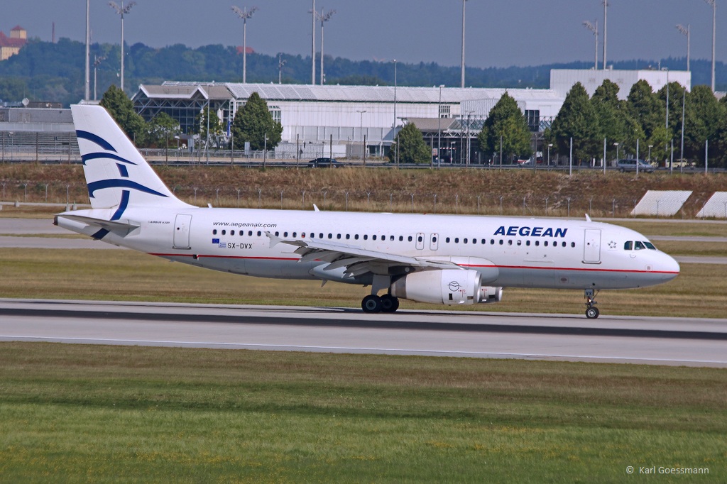 Aegean Airlines, SX-DVU "Pheidias", A320-232 beim Start in MUC nach Thessaloniki (SKG) 14.05.2013 Die Maschine trägt backbord die Aufschrift "Discover the new Acropolis museum". Karl Goessmann