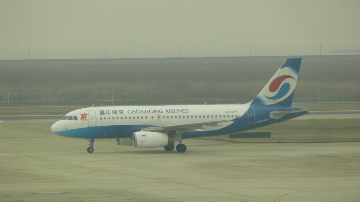 A319 am 4.3.2010 in Xian. Das war ein Nebeltag. Aufnahme aus dem Flugzeug. Die Kennung lautet B-6247 von Chongqing Airlines