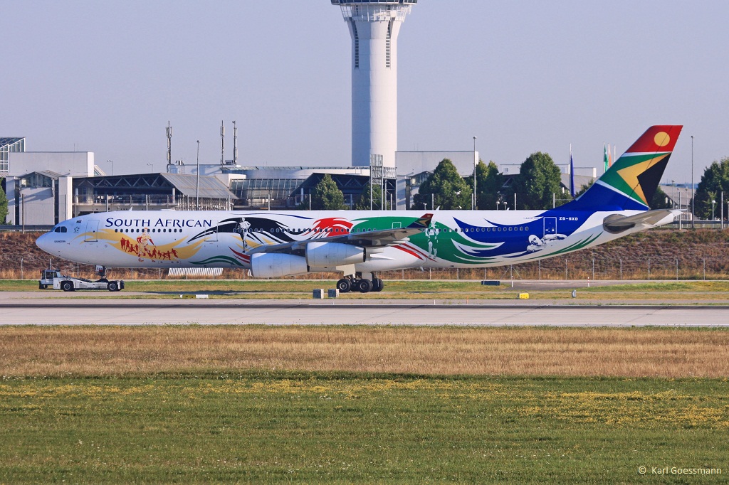 ZS-SXD  Siyanqoba  / South African Airways / A 340-313X wird in MUC zum Frachtterminal geschleppt. 17.08.2013