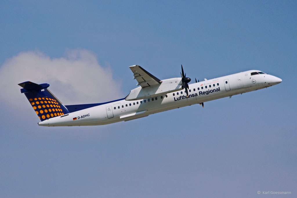 D-ADHB / Augsburg Airways / DHC 8-402Q in MUC im Steigflug nach Bilbao (BIO) 17.07.2013
