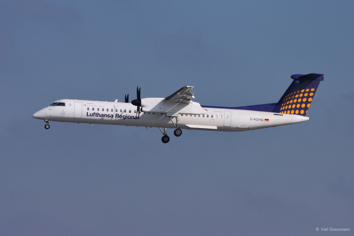 D-ADHS / Augsburg Airways / DHC 8-402Q in MUC im Landeanflug aus Turin (TRN) 14.03.2013