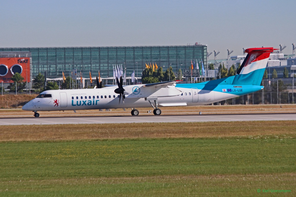 LX-LGE / Luxair / DHC 8-402Q in MUC beim Start nach Luxemburg (LUX) 02.08.2013