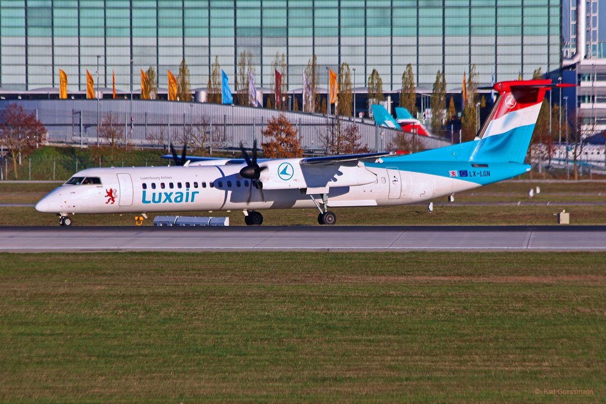 LX-LGN / Luxair / DHC 8-402Q in MUC vor dem Start nach Luxemburg (LUX) 25.11.2013