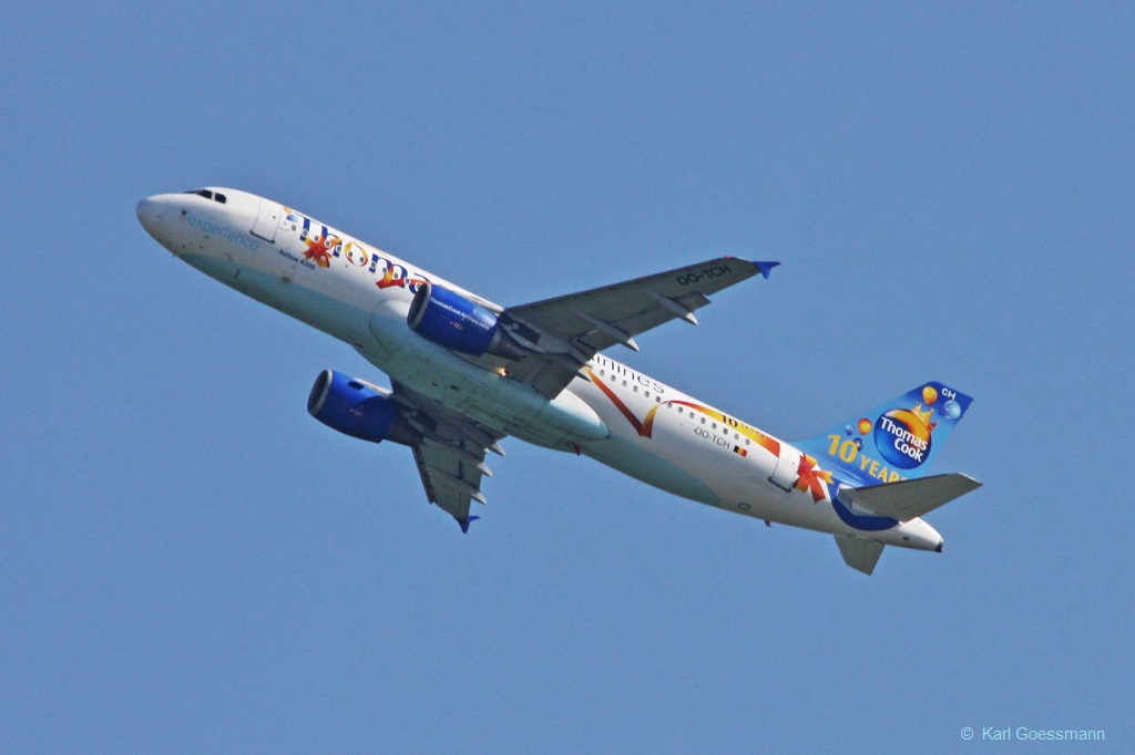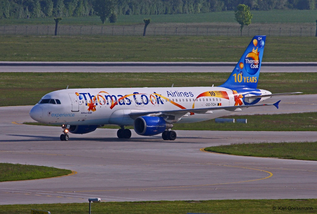 Thomas Cook Airlines Belgium, OO-TCH "Experience", A 320-214 rollt nach der Landung aus London-Gatwick (LGW) in MUC zum Terminal 1. 19.05.2012. Die Maschine hatte die Jubiläums-Sticker nur auf der linken Seite ! Karl Goessmann