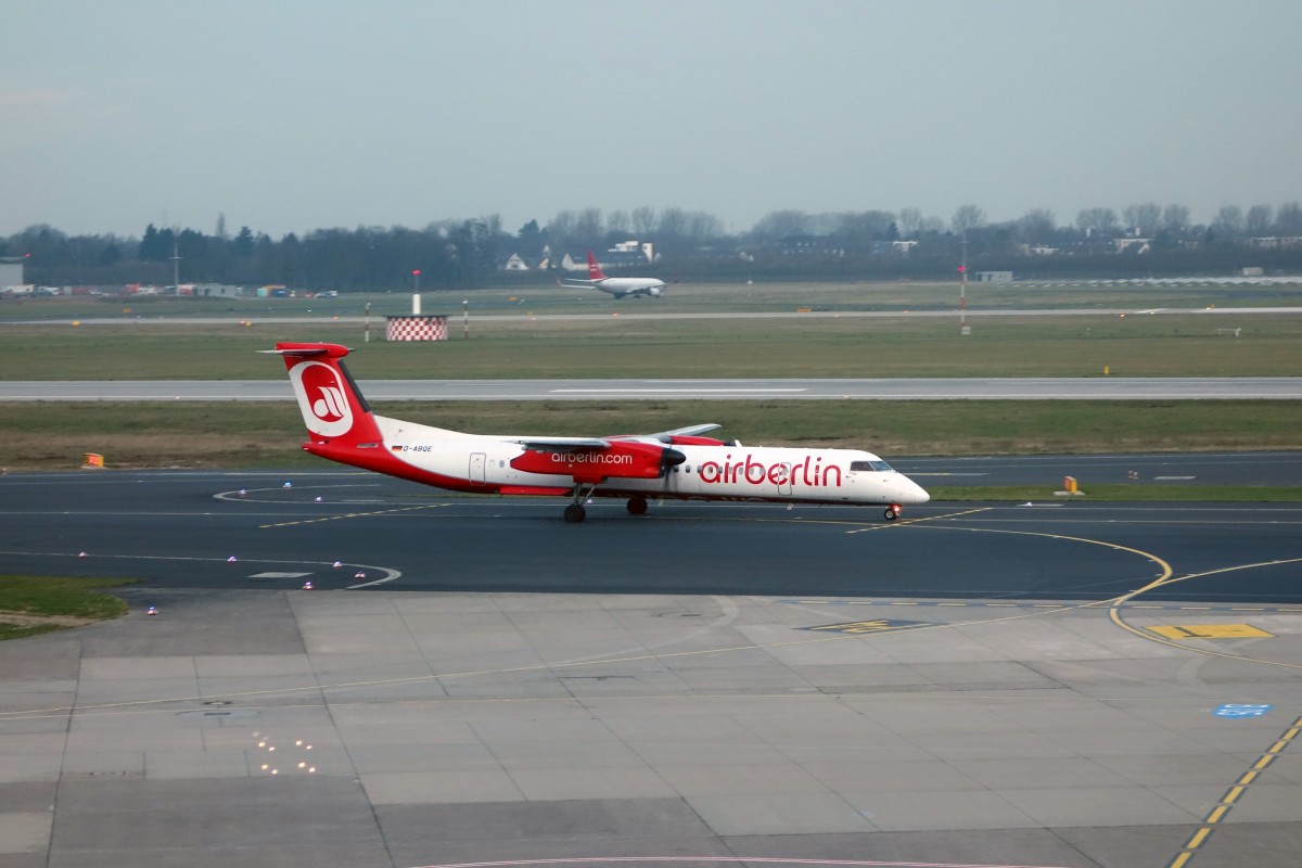 Air Berlin (D ABQE) De Havilland Canada DHC-8-402Q rollt zum Start. Düsseldorf.30.01.2014
