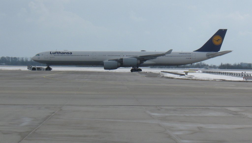 Lufthansa, D-AIHU, Airbus A 340-600 (ohne Namen), 2009.06.20, MUC, München, Germany